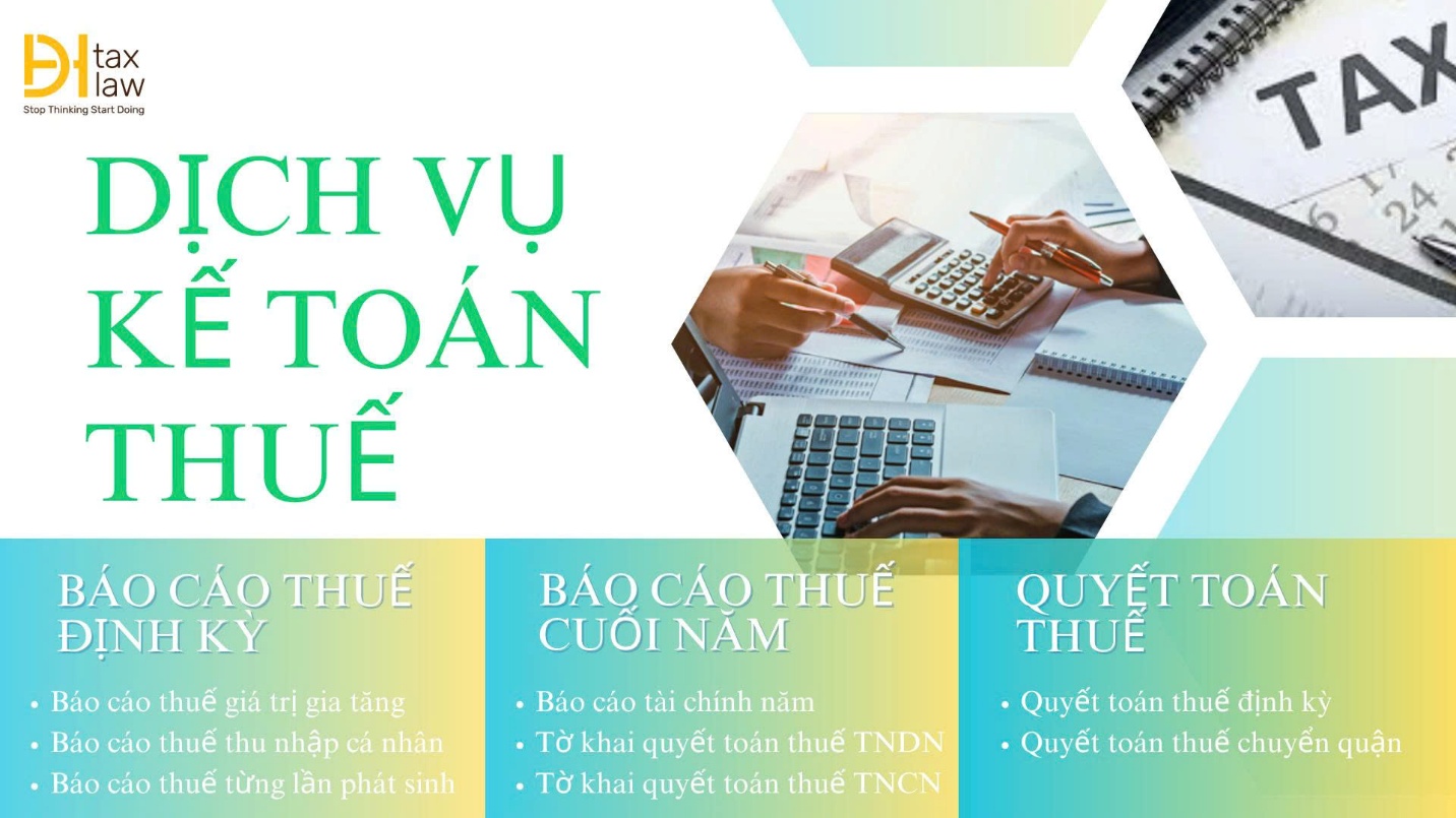 Với uy tín trong ngành, DHtaxlaw tự hào là một trong những đơn vị cung cấp dịch vụ kế toán thuế chuyên nghiệp hàng đầu. Đội ngũ kế toán viên giàu kinh nghiệm của chúng tôi sẽ hỗ trợ doanh nghiệp giải quyết mọi vấn đề liên quan đến kế toán thuế, bao gồm dịch vụ báo cáo thuế trọn gói, cụ thể như sau: