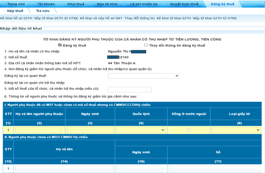 Hướng dẫn đăng ký người phụ thuộc online năm 2024 cho cá nhân trực tiếp đăng ký: