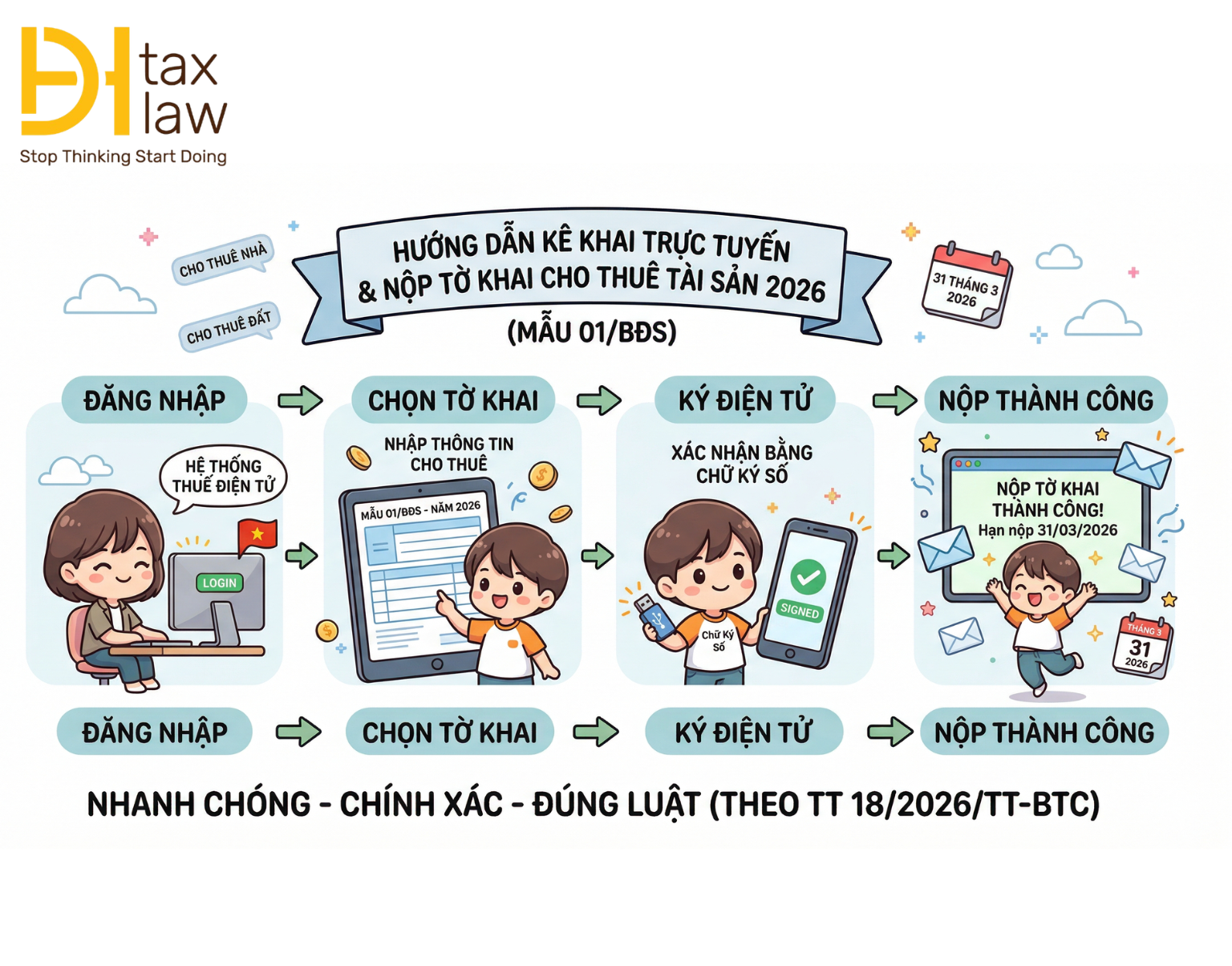 Bài viết dưới đây DHtaxlaw sẽ hướng dẫn chi tiết cách kê khai trực tuyến và nộp tờ khai mẫu 01/BĐS theo quy định mới nhất tại Thông tư 18/2026/TT-BTC, giúp bạn thực hiện đúng quy trình và tránh sai sót.